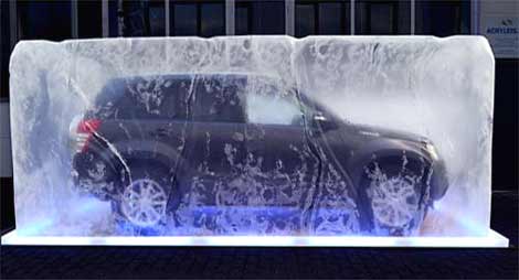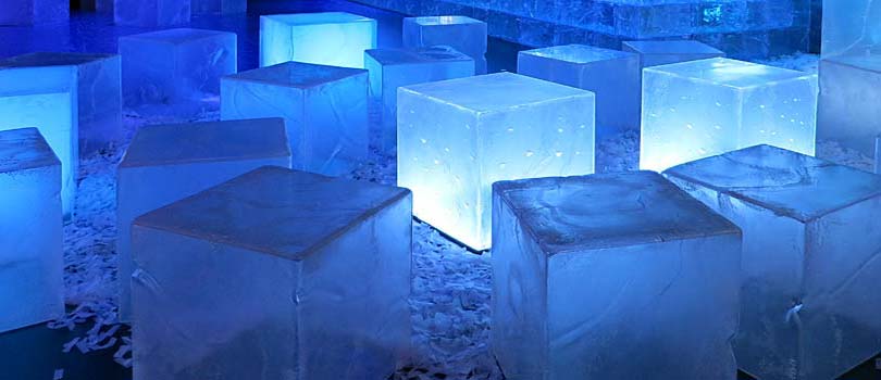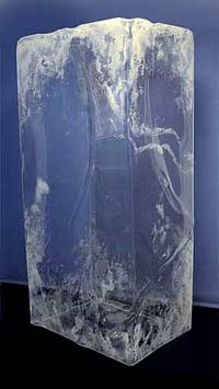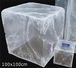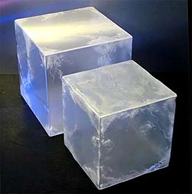 Wir fertigen Eiswürfel und Eisblöcke in Hohlbauweise mit frostiger Eisoberfläche für Dekoration, Event, Film, Theater,TV, etc. bis zur Grösse 120x120cm Wir betten auch Logos oder Produkte ein. >Einbettungen |